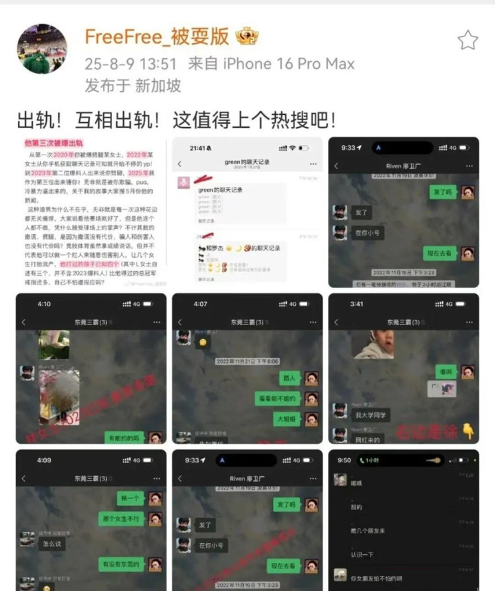 爆料内容触目惊心。情感方面,徐杰被指2020年起多次出轨,致至少4名女性流产,其中“L女士”自称三次流产。聊天记录中“打胎次数比总冠军戒指还多”的言论更是引发公愤。爆料人还指控其存在PUA行为,不仅泄露前女友存款、工作等隐私给第三者,更在情感纠纷中发生肢体冲突,出现“被扇耳光、下跪求饶”等戏剧性场景。